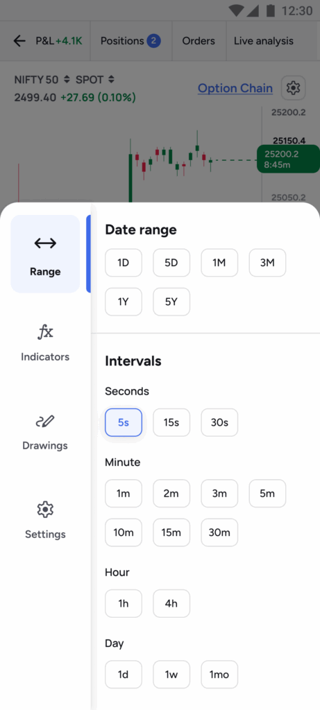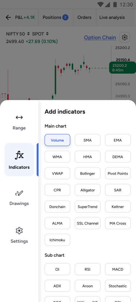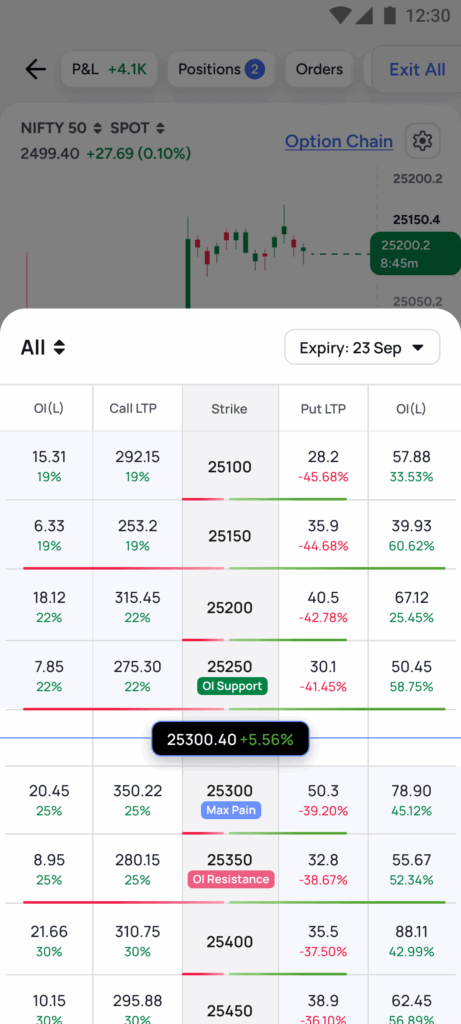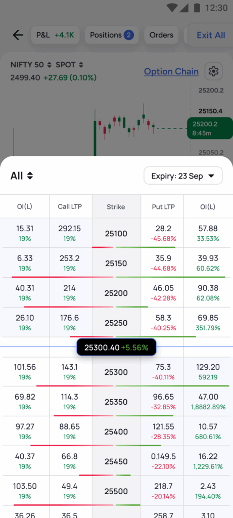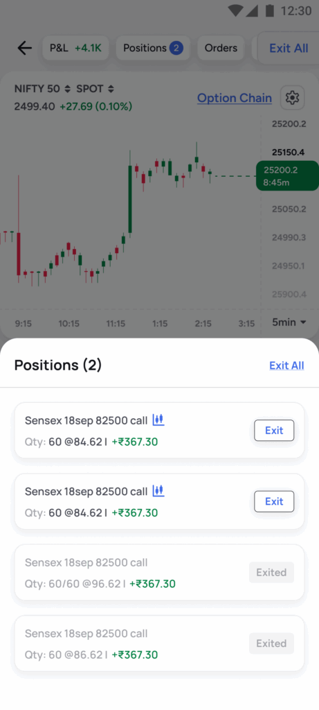 - No more toggling between multiple screens to place orders. Charts, option chains, positions, and order books are all available on a single screen, enabling traders to respond faster to market movements.