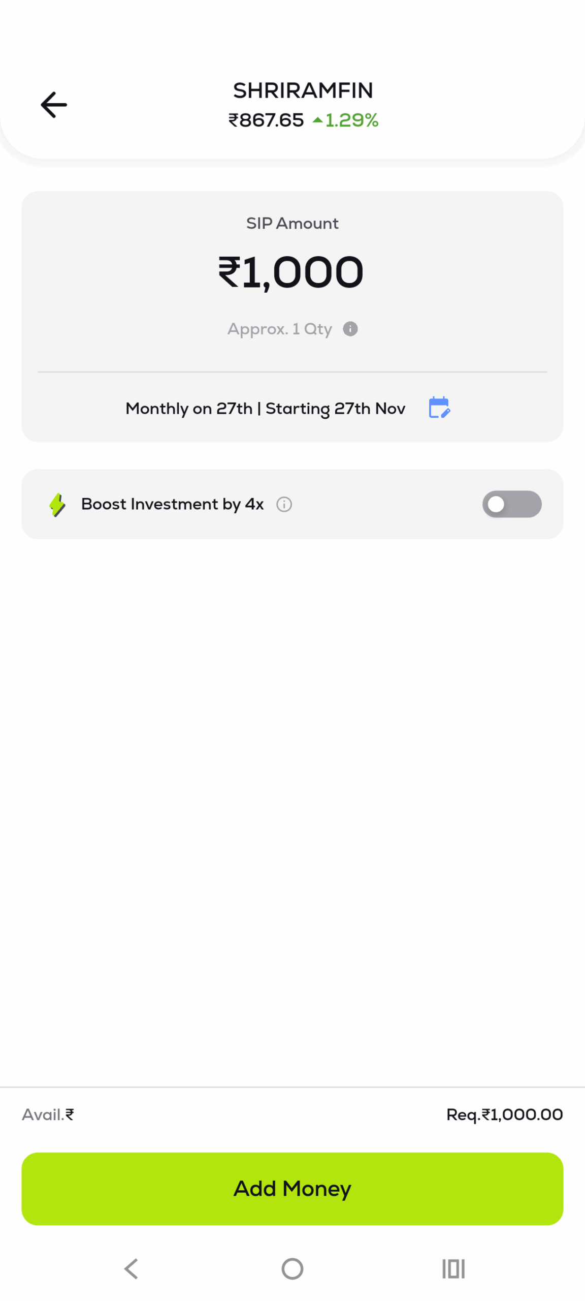 Note: If the stock does not have MTF enabled, you will not see the Boost Investment toggle. However, you can proceed with normal SIP in the stock